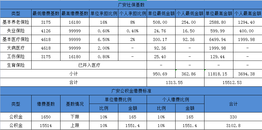 以下是廣安市2021年社保、公積金繳費基數表