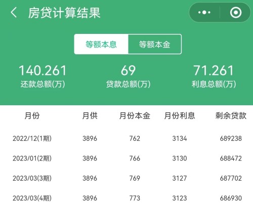 從上兩張圖可以看到,房貸本金69萬,一共需要還71.261萬利息;總共是140.261萬。