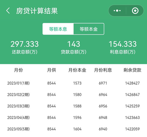 從以上兩張圖可以看到,143萬,利率5.85%,貸款年限29年,總的利息是154.333萬,都超過了剩余未還商貸的本金了,每個月的還款都是8500多,是好多人兩三個月的工資了,小編都被這數字給嚇著了。