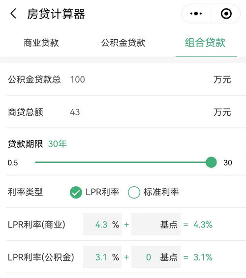 因為個人公積金貸款上限是50萬,夫妻雙方公積金貸款上限是100萬,多子女家庭公積金貸款上限是120萬。小編這里就是按照正常夫妻雙方公積金貸款上限100萬,和商貸43萬,組合進行計算。從以上兩圖可以看到,公積金貸款利率3.1%,商貸部分利率是按照明年的利率4.3%,貸款年限30年進行計算,計算結果可以看到總的利息是87.332萬。